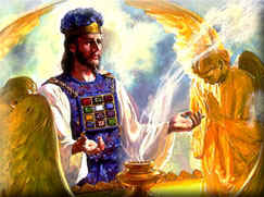 First we will consider what happened in the Holy Place of the earthly sanctuary every day of the year. Picture # 1 on the left shows the Holy Place. Every day when a sacrifice was offered, the priest would bring some blood into this room and sprinkle it on the vail behind the alter of Incense that we see just before the curtain, close to the priest. Sometimes the priest would place some the blood on the horns of the alter of Incense that we see just before the curtain. This action, signified the transfer of the sins of the person to the Sanctuary. The person was forgiven his transgressions. That blood was a "symbol" or "type" of the "blood" of Jesus Christ –